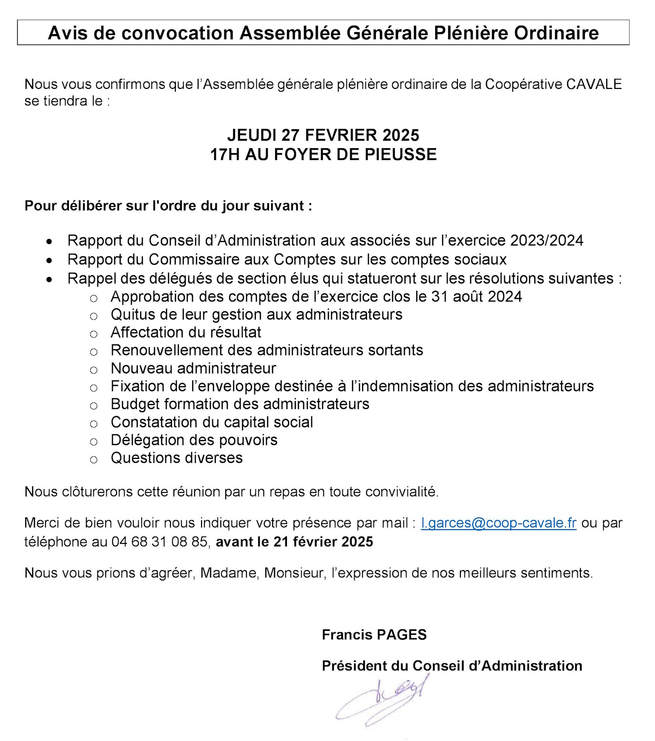 Merci de bien vouloir nous indiquer votre présence par mail : l.garces@coop-cavale.fr ou par téléphone au 04 68 31 08 85, avant le 21 février 2025
