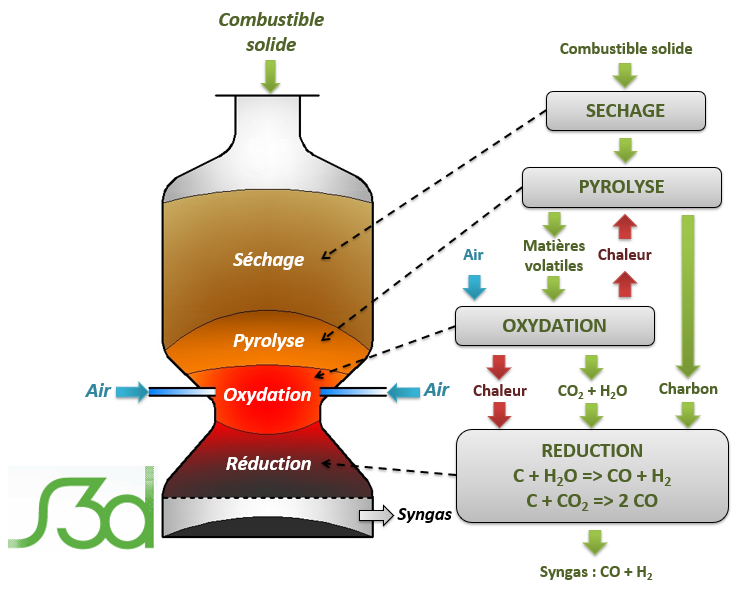 Une phase de pyrolyse qui produit, sous l’effet de la chaleur en absence d’agent oxydant, des matières volatiles (CO, CO2, H2, CH4, H2Ovap et hydrocarbures gazeux appelés « goudrons ») et du charbon essentiellement constitué de carbone fixe