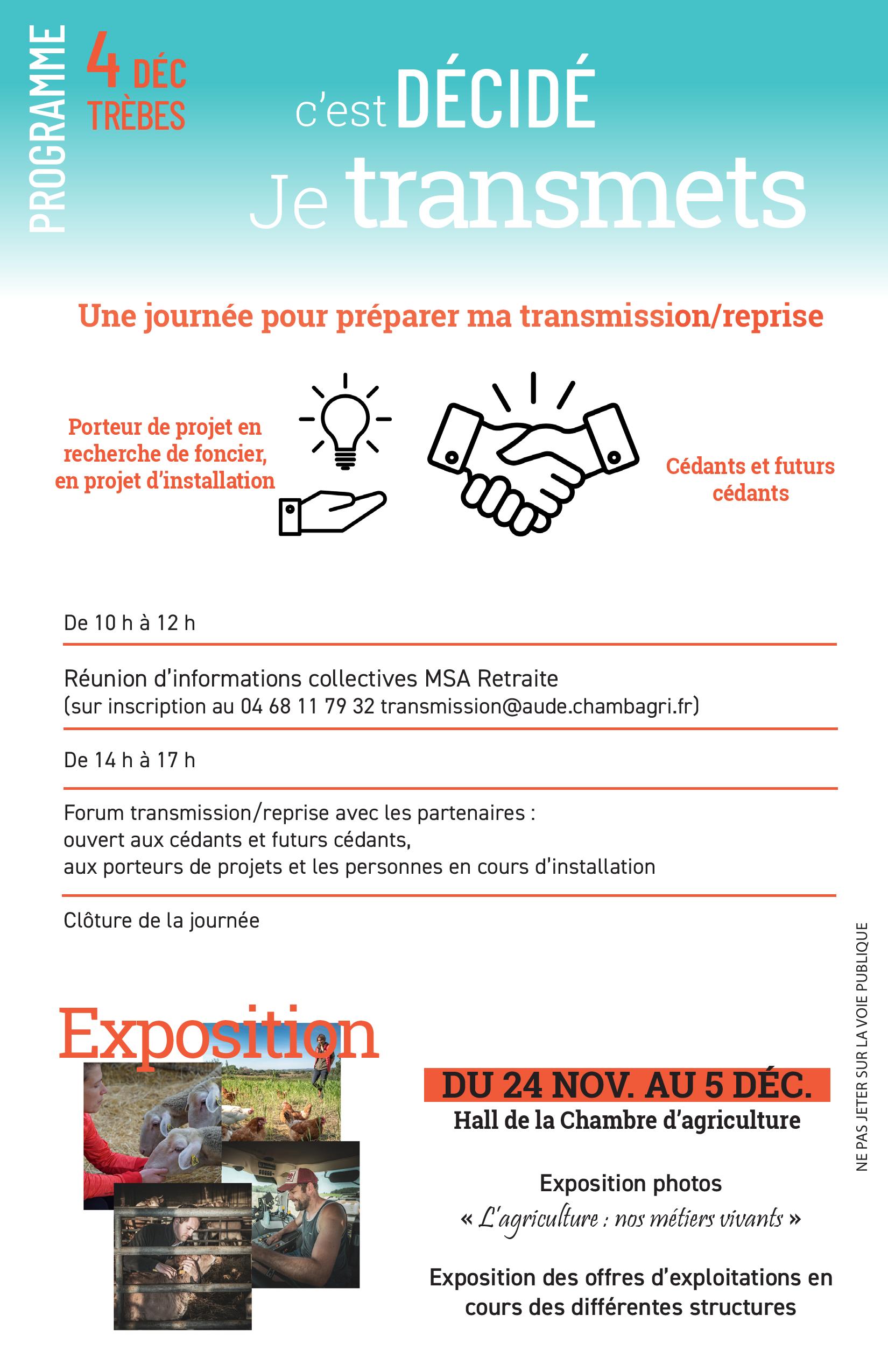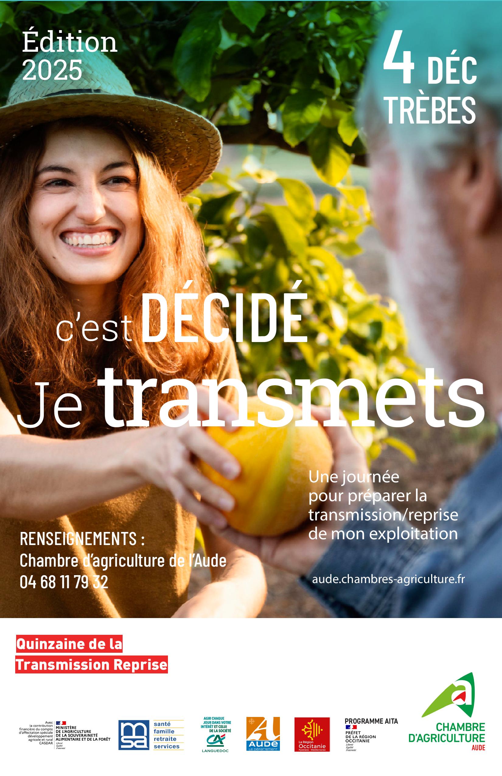Dans le cadre de la 10ᵉ Quinzaine de la Transmission / Reprise, la Chambre d’Agriculture de l’Aude organise une journée départementale dédiée à la sensibilisation, l’information et l’accompagnement des agriculteurs et futurs agriculteurs.